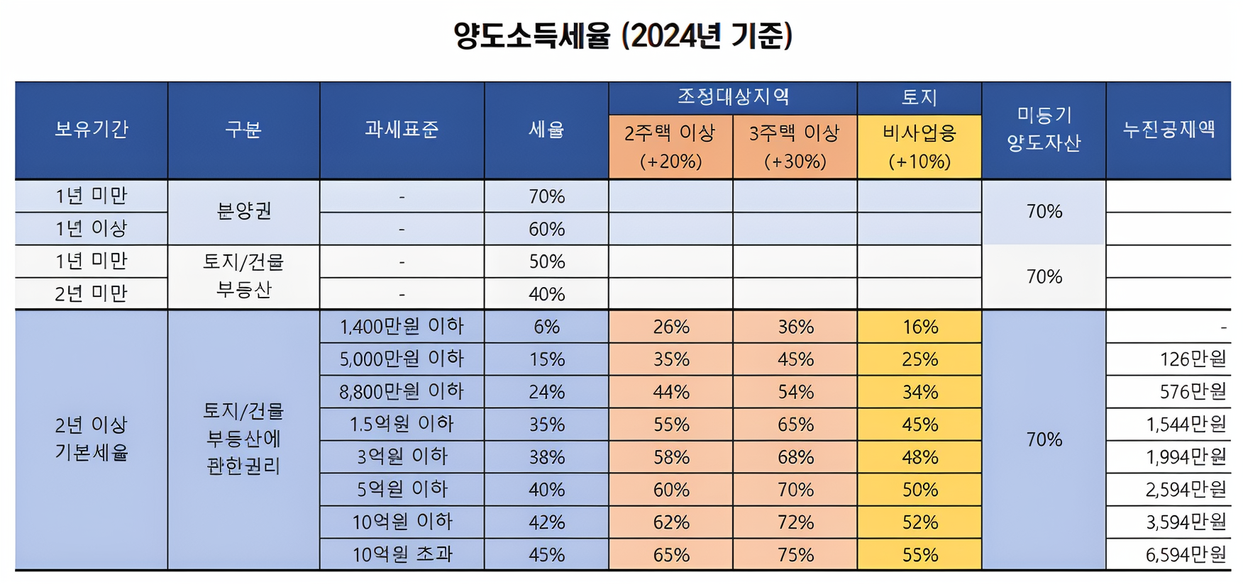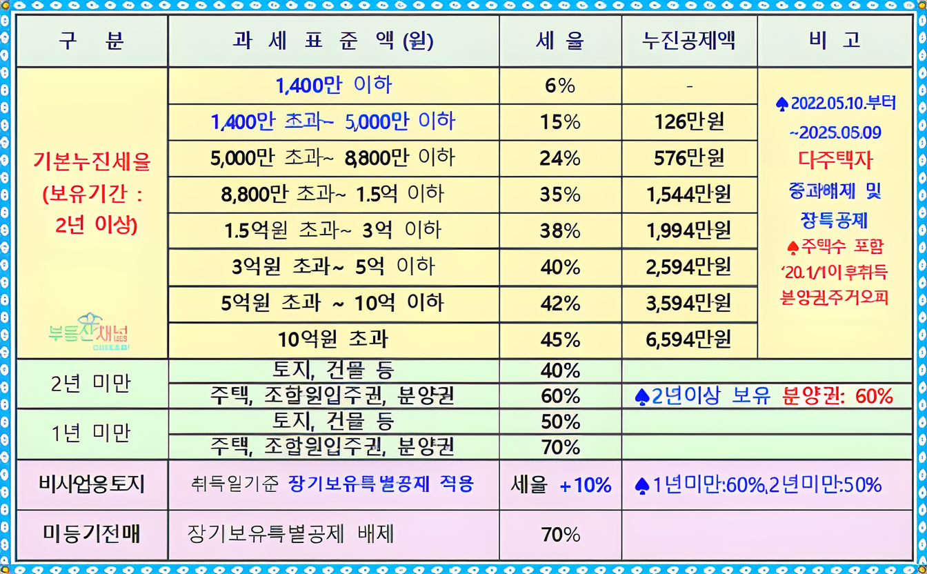 - 보유 기간에 따른 세율 적용: 양도소득세는 보유 기간에 따라 세율이 달라집니다. 일반적으로 보유 기간이 길수록 낮은 세율이 적용되며, 단기 보유 시에는 높은 세율이 부과됩니다. 다주택자의 경우 추가로 중과세율이 적용될 수 있습니다.